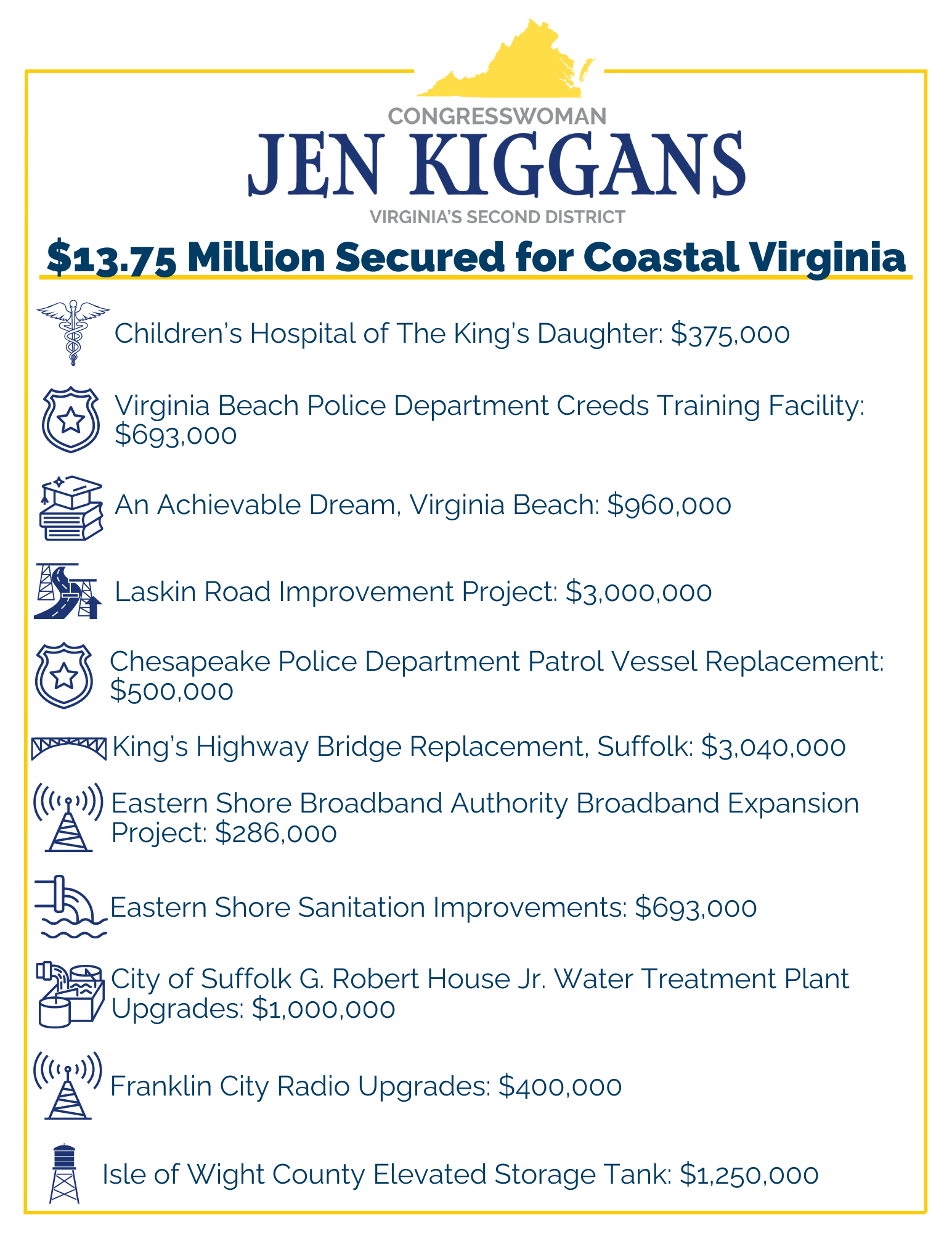 “It’s only right for our hard-earned taxpayer dollars to get returned to our communities,” said Congresswoman Kiggans. “I was proud to fight for these important funding requests on behalf of Southeast Virginia and look forward to seeing the positive impacts they will have back home…!”