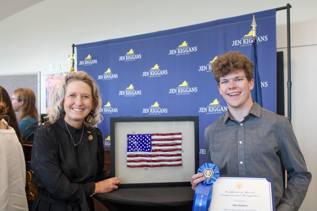 VIRGINIA BEACH, VA: This week, at a reception hosted at Virginian Wesleyan University, Congresswoman Jen Kiggans (VA-02) announced Alex Hudson as the winner of Virginia’s Second District 2024 Congressional Art Competition. Alex Hudson is currently in his senior year at Catholic High School and won with his piece titled Waves of Freedom.