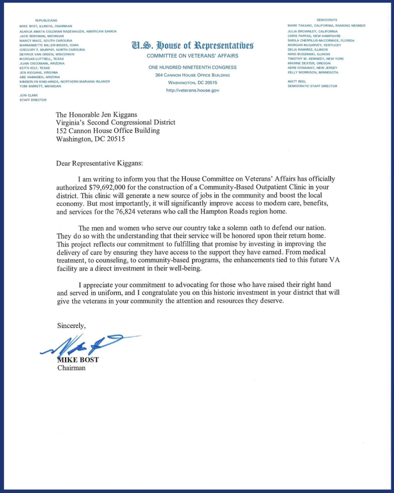 House Veterans’ Affairs Committee Chairman Mike Bost (R-IL) praised Kiggans’ leadership in securing the funding.