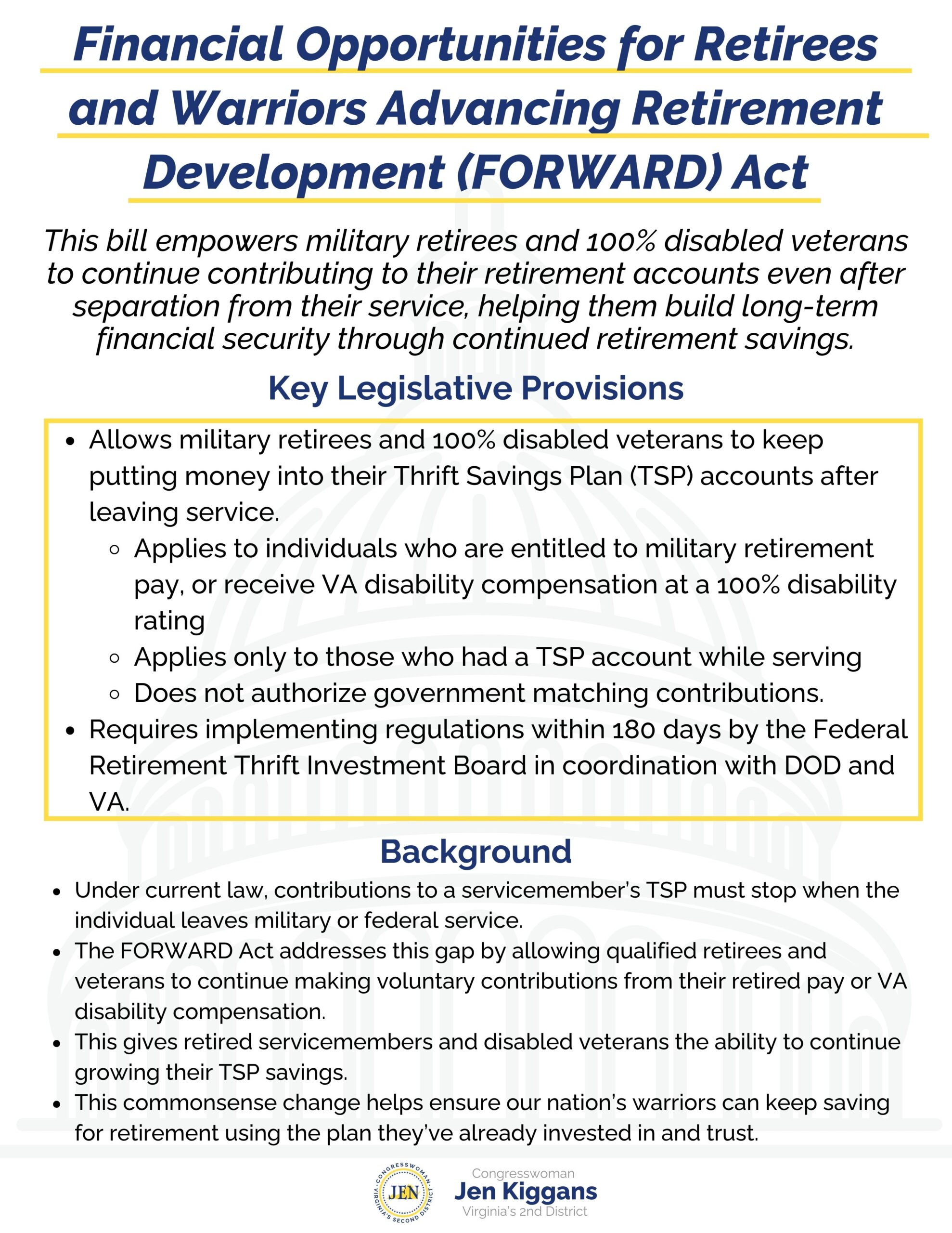 Background: Under current law, contributions to a servicemember’s TSP must stop when the individual leaves military or federal service. The FORWARD Act addresses this gap by allowing qualified retirees and veterans to continue making voluntary contributions from their retired pay or VA disability compensation. This legislation directs the Federal Retirement Thrift Investment Board—working in coordination with the Department of Defense and the Department of Veterans Affairs—to implement this change, giving retired service members and disabled veterans the ability to continue growing their TSP savings.