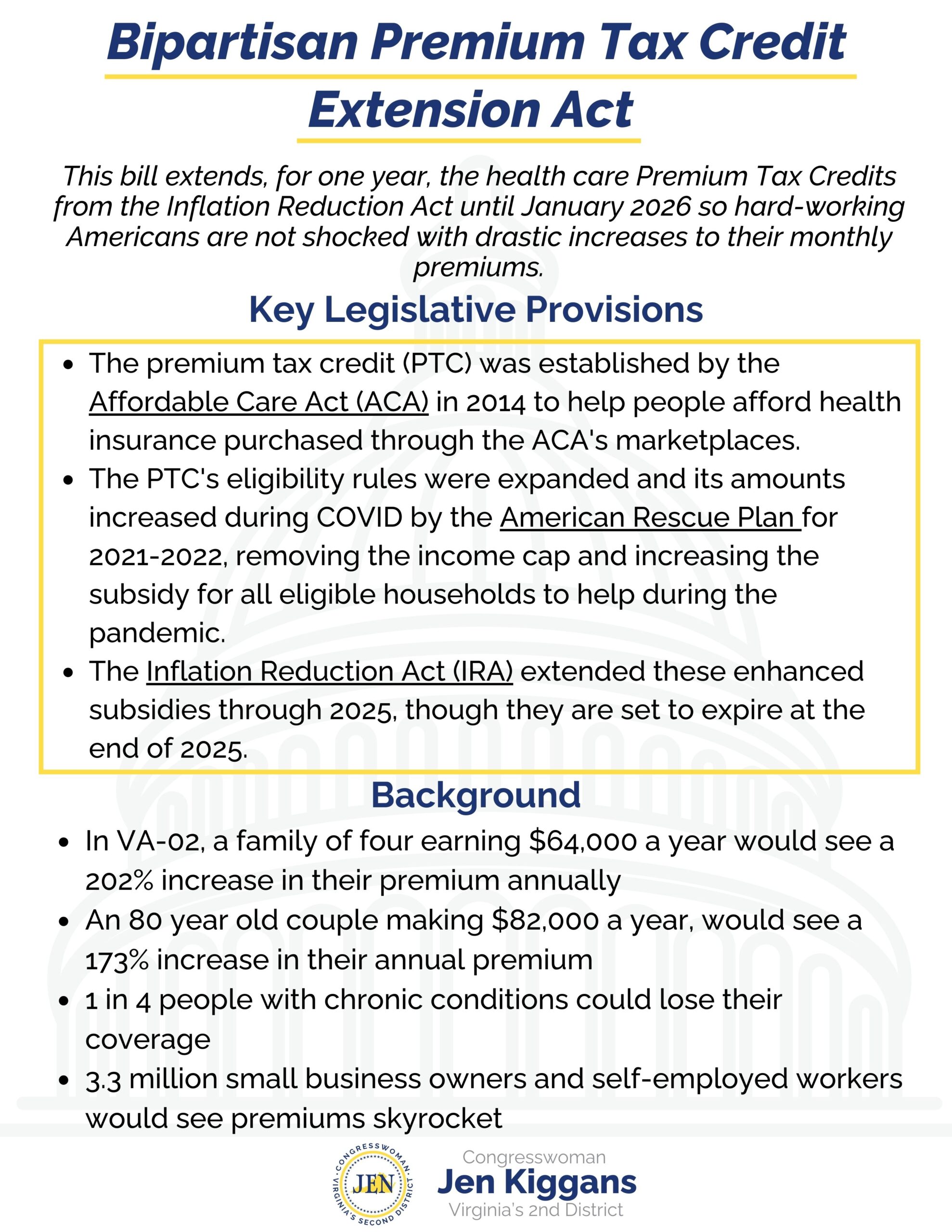 Washington, D.C. — Today, Reps. Jen Kiggans (VA-02) and Tom Suozzi (NY-03) introduced the Bipartisan Premium Tax Credit Extension Act, a bill to protect Virginia families, seniors, and small business owners from massive health care premium increases.