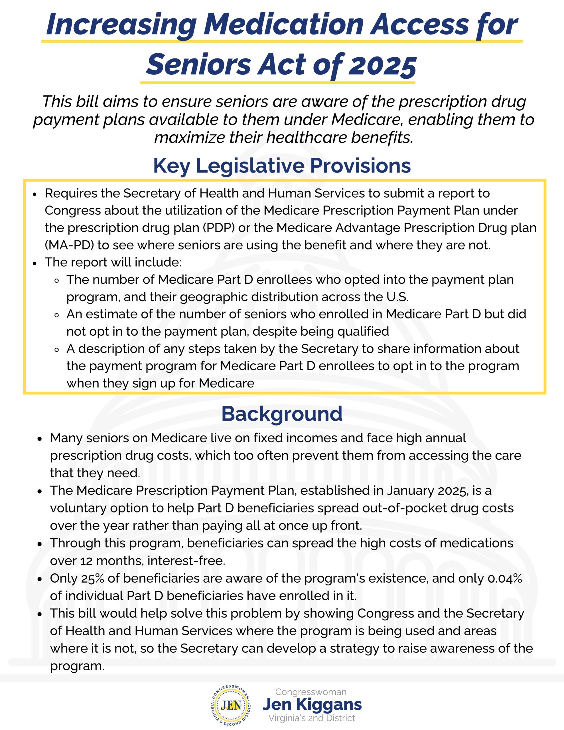 Kiggans also introduced the Increasing Medication Access for Seniors Act of 2025 with Congressman Raja Krishnamoorthi (D-IL). The legislation helps Medicare beneficiaries better access the new Medicare Prescription Payment Plan, which allows seniors to spread high annual drug costs over 12 months interest-free. While the program began in January 2025, very few seniors are aware of it, and fewer than 0.05% have enrolled—even though many would benefit from lower upfront costs.