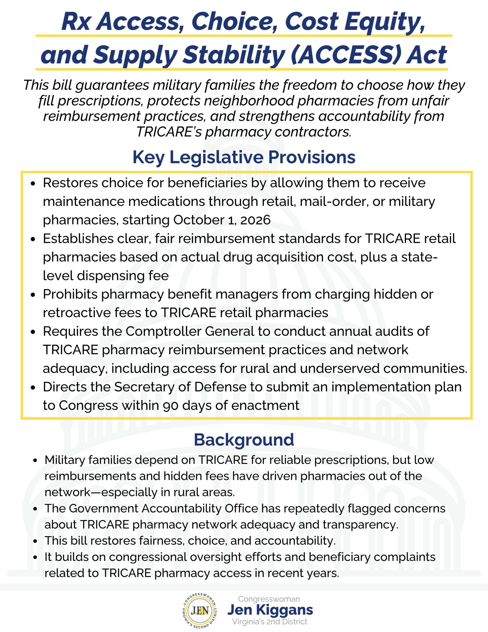 “Military families shouldn’t have to jump through hoops to get the medications they rely on,” said Besa Pinchotti, CEO of NMFA. “We’re grateful to Rep. Jen Kiggans for stepping up with the Rx ACCESS Act to make that happen.”