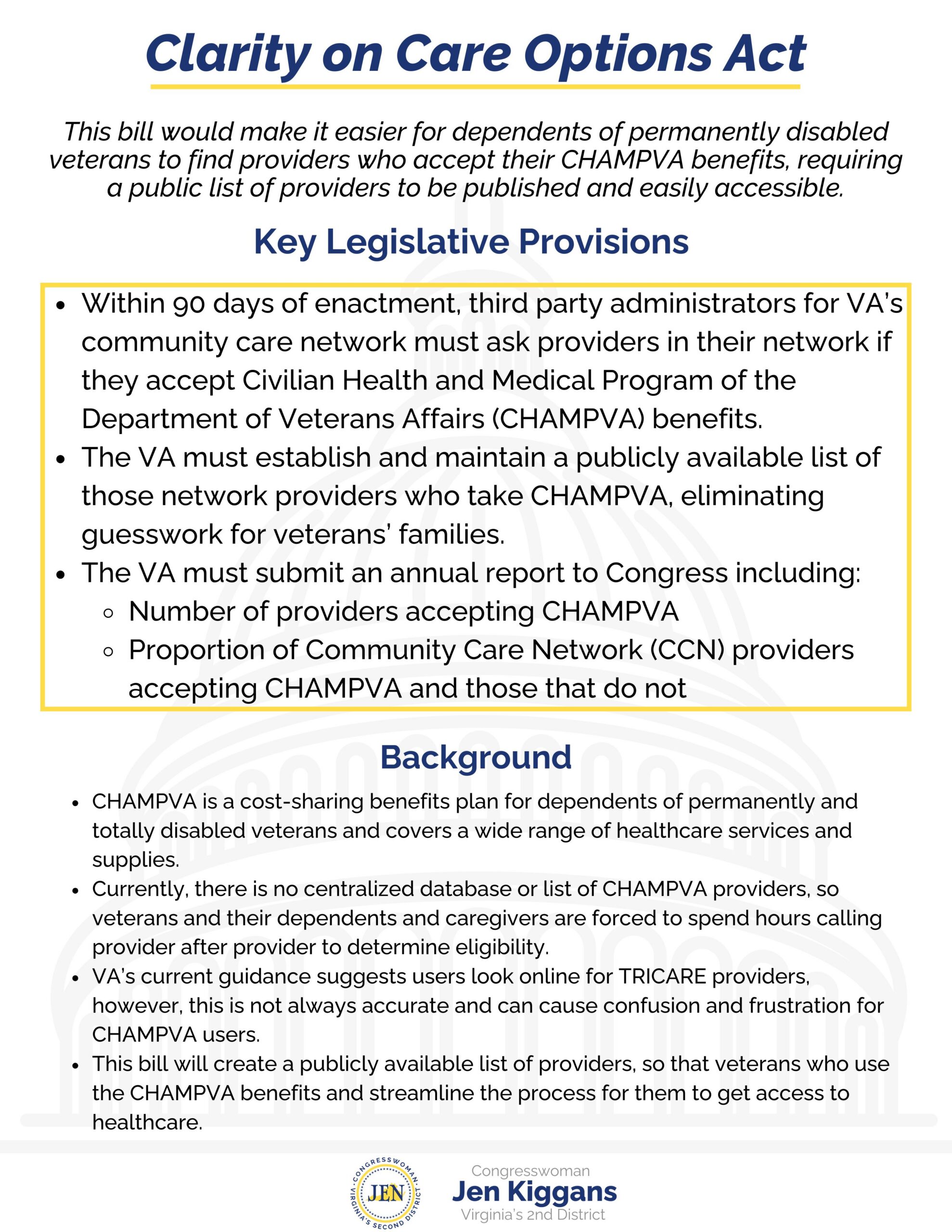 The package also includes my Clarity on Care Options Act, which requires the Department of Veterans Affairs to create and maintain a publicly available directory of health-care providers who accept CHAMPVA. This ensures the spouses, survivors, and family members who rely on CHAMPVA can easily find providers willing to treat them, something that is currently far too difficult for families navigating the system.