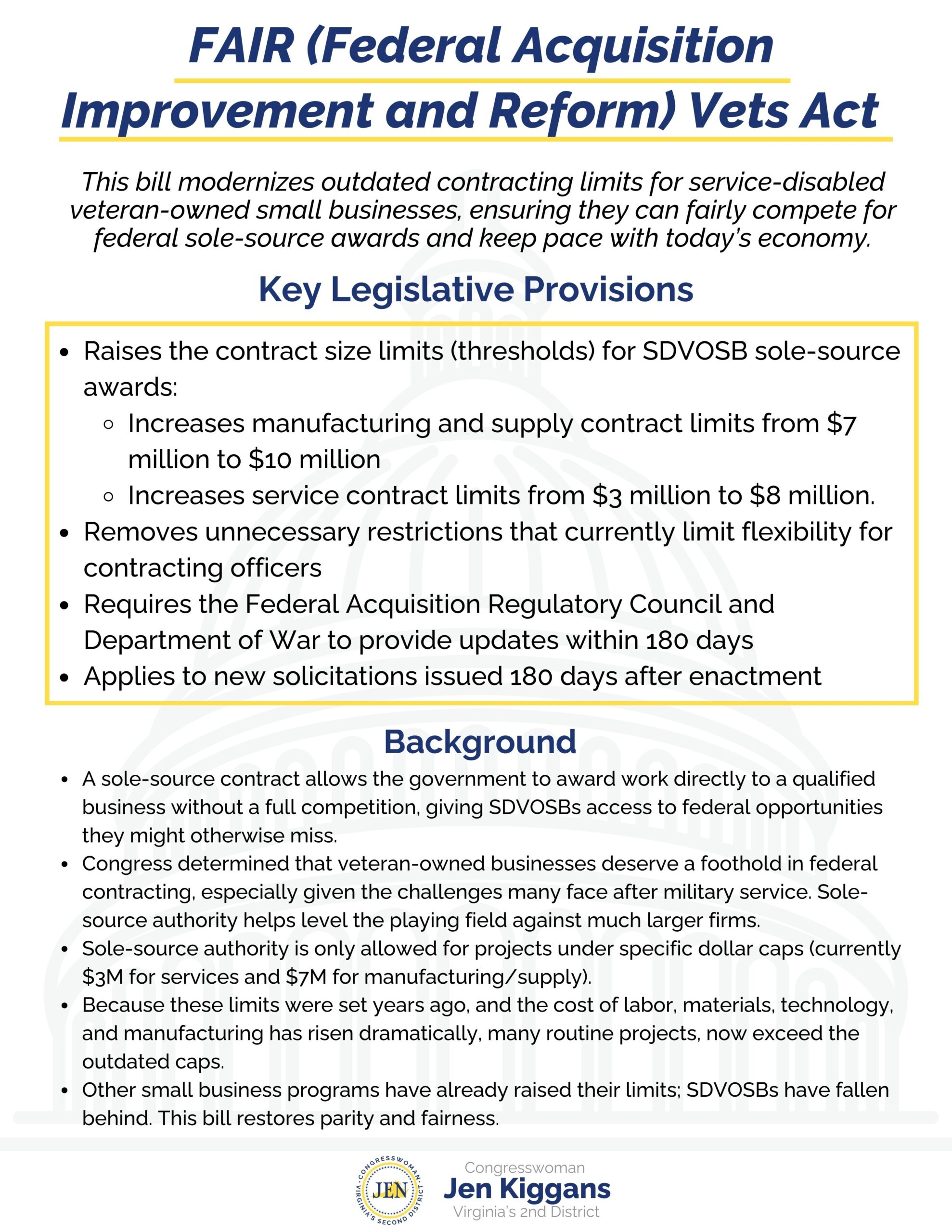 The package also includes the FAIR (Federal Acquisition Improvement and Reforms) Vets Act, co-led by Reps. Don Bacon (R-NE) and Joe Neguse (D-CO), which updates outdated federal contracting thresholds to ensure service-disabled veteran-owned small businesses are able to compete for more and larger projects. The bill helps level the playing field for veteran entrepreneurs by modernizing rules that have not kept pace with today’s costs and contracting structure.