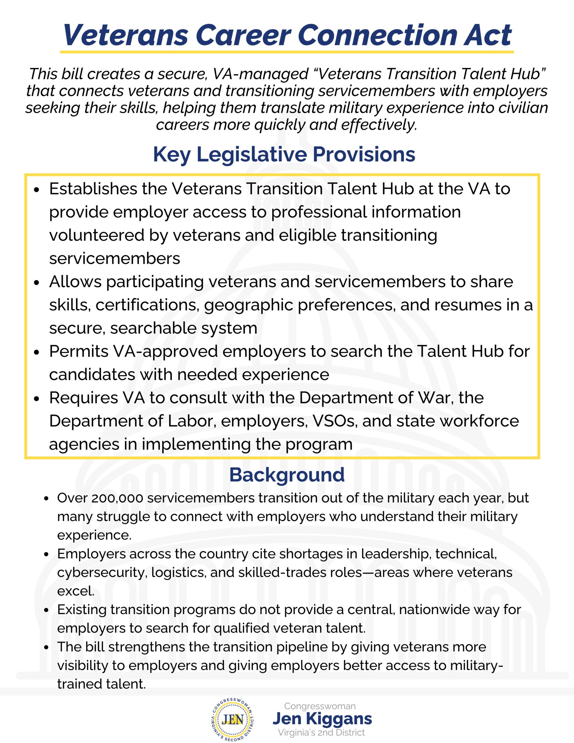 Washington, D.C. — Congresswoman Jen Kiggans (VA-02) introduced a bipartisan package of four bills that strengthen veterans’ health, improve access to care, support veteran-owned small businesses, and connect veterans and their families with trusted resources. Together, these bills provide practical, targeted solutions to help veterans live healthier lives, navigate benefits more easily, and remain supported long after their military service. The legislation is co-led by Representatives Jimmy Panetta (D-CA), Don Bacon (R-NE), Joe Neguse (D-CO), and Wesley Bell (D-MO).