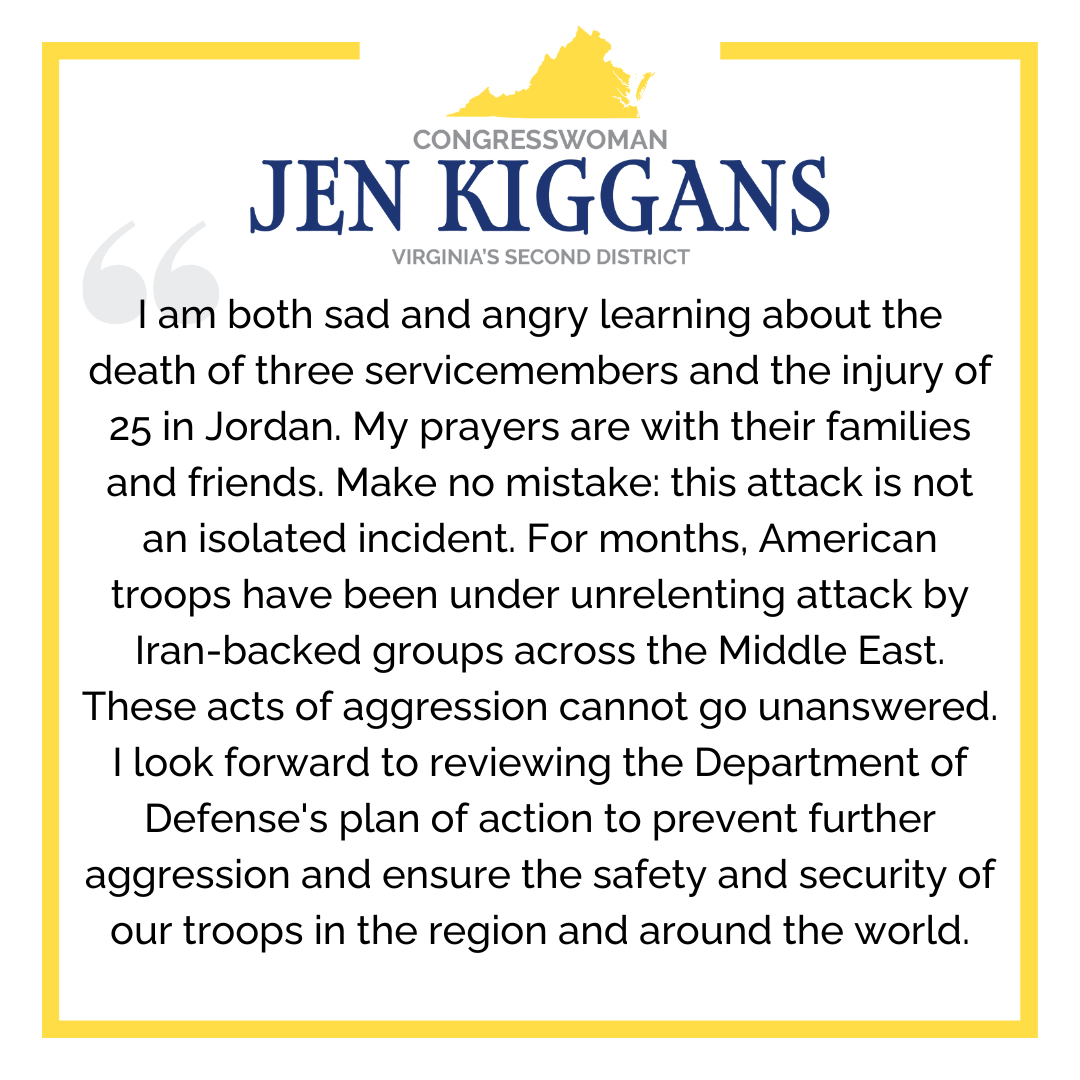 WASHINGTON, DC: Today, Congresswoman Jen Kiggans (VA-02) released the following statement regarding reportsthat three American servicemembers were killed and 25 were…