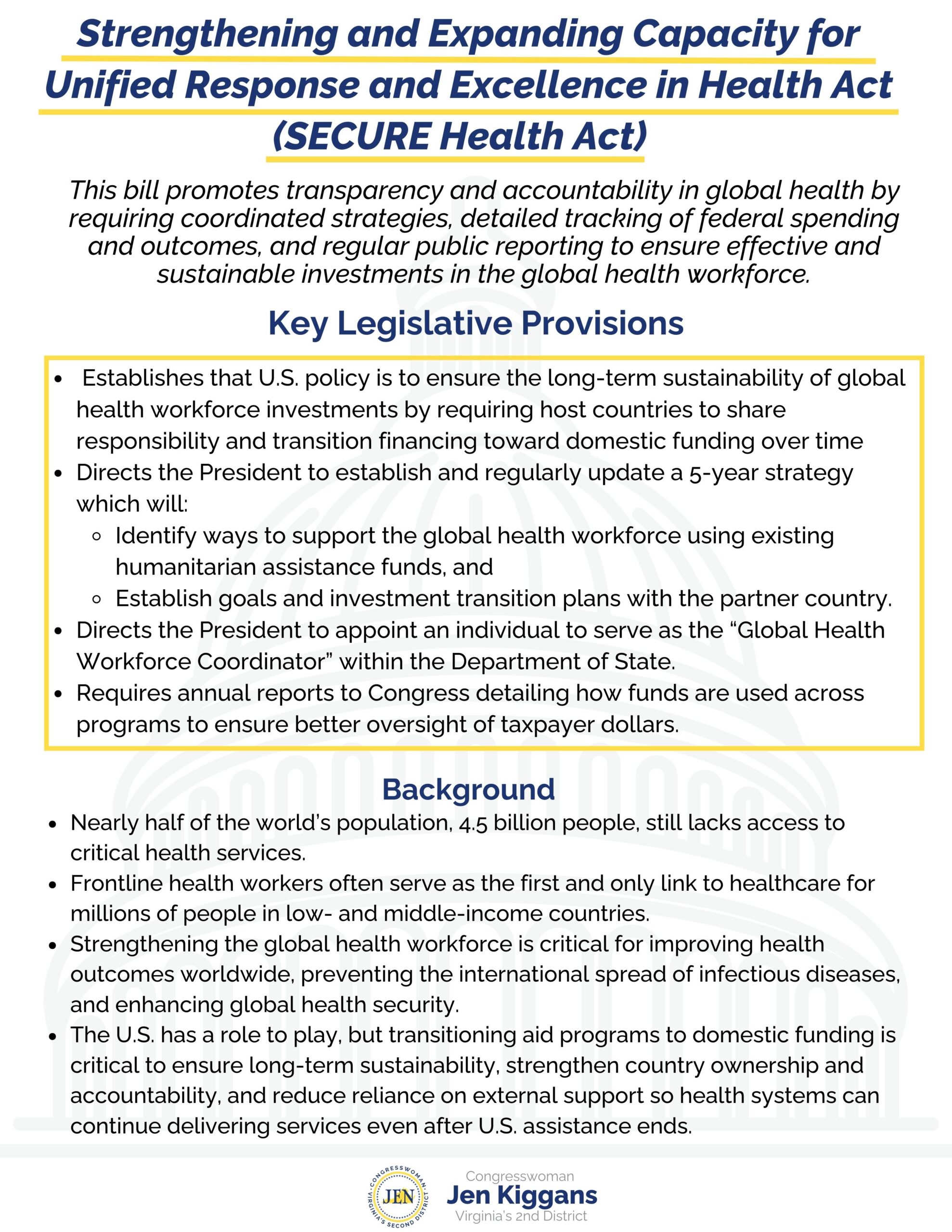 Congresswoman Kiggans said, “As a nurse practitioner, expanding access to quality and efficient care has been one of my top priorities since entering Congress in 2023. The SECURE Health Act directly addresses the reality that nearly half the world still lacks access to critical health services by strengthening and supporting the global health workforce. Through coordination with the President and federal agencies, this bill strengthens training and protections for the global health workforce and establishes a five-year strategy to maximize existing resources and drive future investment. This is about reinforcing America’s leadership and impact around the world.”
