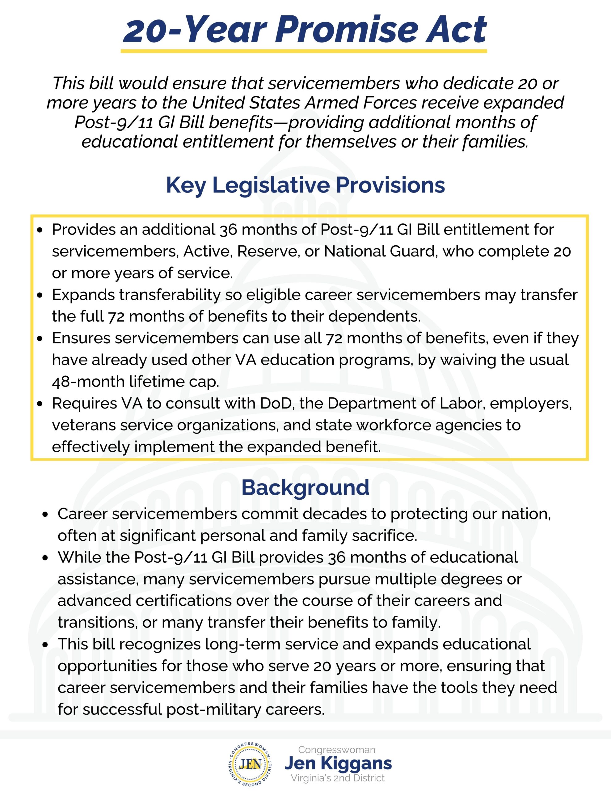 Congresswoman Kiggans said, “Our servicemembers who dedicate 20 or more years to defending our nation have upheld their commitment to America. The 20-Year Promise Act ensures we uphold ours. By expanding Post-9/11 GI Bill benefits to provide an additional 36 months of educational assistance, this legislation recognizes the sacrifices of career servicemembers and gives them and their families greater flexibility to pursue advanced degrees, certifications, or transfer benefits to their dependents. As a Navy veteran, I know firsthand the commitment it takes to serve a full military career, and I’m proud to introduce this legislation that invests in their success after they leave the service.”