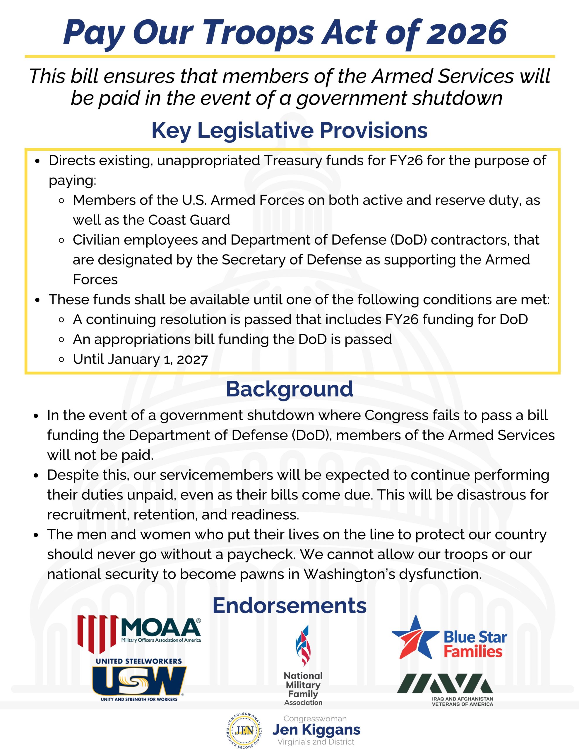 Washington, D.C. – Today, Congresswoman Jen Kiggans (VA-02), a Navy veteran and member of the House Armed Services Committee, introduced the Pay Our Troops Act of 2026. This bipartisan legislation ensures that members of the U.S. Armed Forces, including the Coast Guard, continue receiving pay and benefits in the event of a government shutdown.