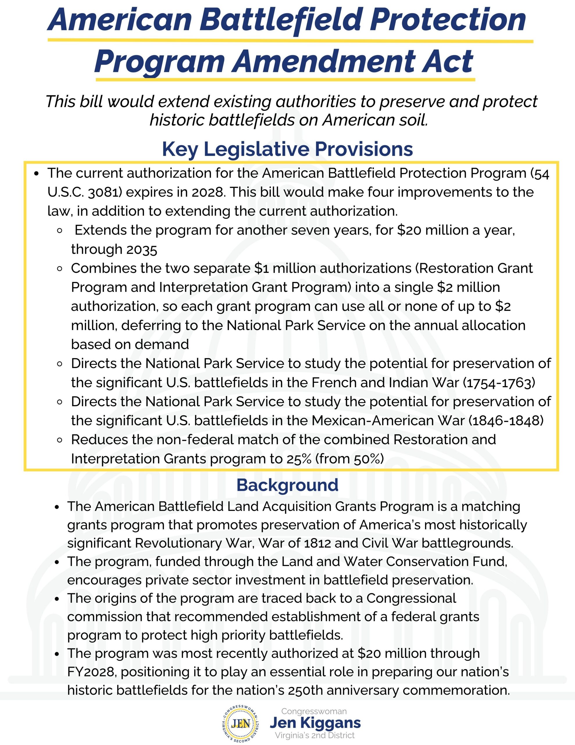 WASHINGTON, D.C. — Today, Rep. Jen Kiggans (VA-02) and Rep. Seth Magaziner (RI-02) introduced the American Battlefield Protection Program Amendment Act of 2026 to extend and increase federal resourcing for the American Battlefield Protection Program (ABPP) through 2035. This legislation will continue the important work of preserving and restoring America’s historic battlefields by empowering local communities to maintain and honor the lands where our nation’s freedom was secured.