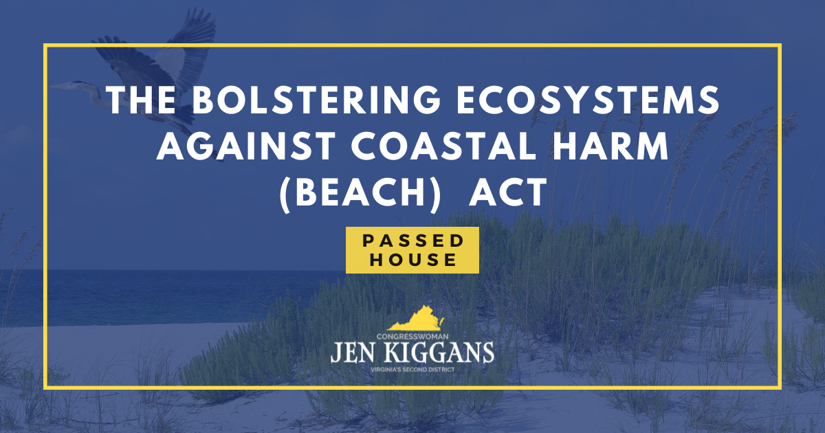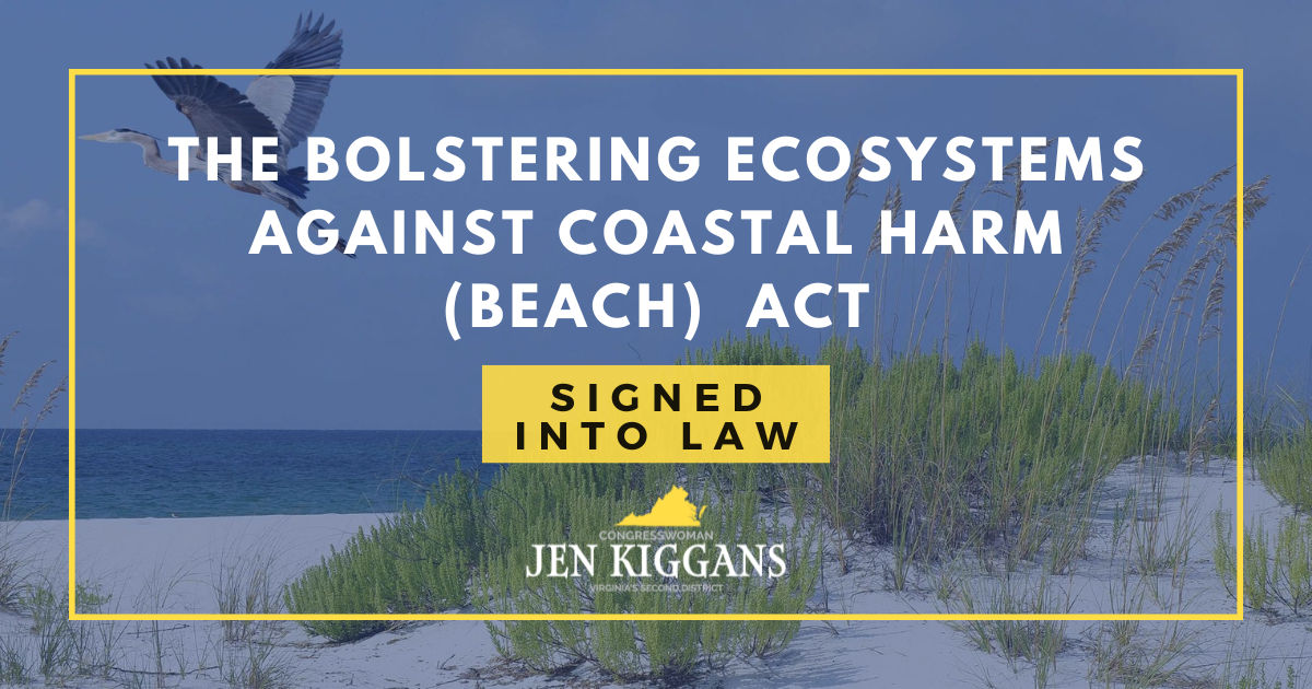 WASHINGTON, DC: Yesterday, Congresswoman Jen Kiggans’ (VA-02) bill, H.R. 5490, the Bolstering Ecosystems Against Coastal Harm (BEACH) Act, was signed into law…