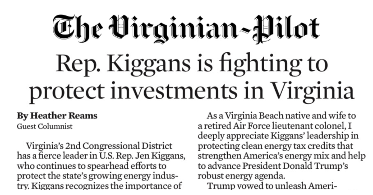 “Virginia’s 2nd Congressional District has a fierce leader in U.S. Rep. Jen Kiggans” WASHINGTON, DC – This week, an opinion piece was published…